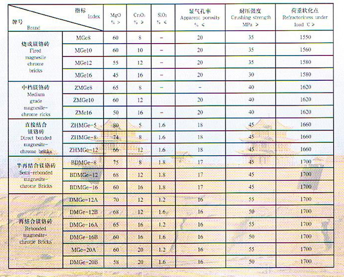 鎂鉻磚:是以燒結(jié)鎂砂和氧化鉻為原料經(jīng)高壓成型、高溫?zé)芍频,具有熱膨脹系?shù)小、抗熱震性能好,抗渣性強等特點,廣泛用于水泥窯、有色冶金爐、玻璃窯蓄熱室等各種工業(yè)窯爐。