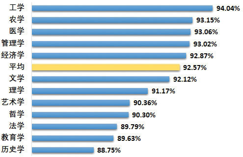 2019年,中國校友會根據(jù)各高校公開發(fā)布的畢業(yè)生就業(yè)質(zhì)量年度報告,統(tǒng)計出了2019年全國113個主流本科專業(yè)(全國辦學(xué)點大于40個的專業(yè))就業(yè)率綜合排名。將各本科專業(yè)的就業(yè)率按學(xué)科門類匯總后可以看出,工學(xué)的本科畢業(yè)生就業(yè)率是所有門類中最高的,達94.04%,高于農(nóng)學(xué)、醫(yī)學(xué)、管理學(xué)、經(jīng)濟學(xué)、文學(xué)、理學(xué)、藝術(shù)學(xué)、哲學(xué)、法學(xué)、教育學(xué)、歷史學(xué)等。