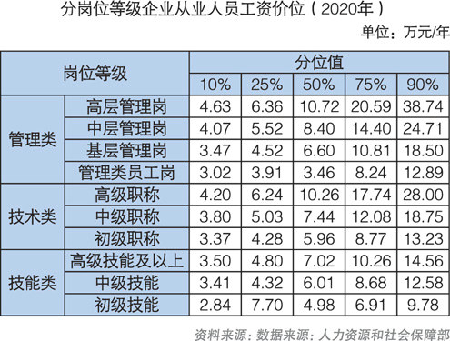 人社部在2021年底發(fā)布了2020年企業(yè)薪酬調(diào)查信息,披露了不同職業(yè)從業(yè)人員工資價位數(shù)據(jù)。所謂工資價位,是指企業(yè)從業(yè)人員在報告期內(nèi)的工資水平,包括基本工資、獎金、津貼和補貼、加班加點工資和特殊情況下支付的工資等。它在一定程度上體現(xiàn)了勞動力市場價格水平。分位值是指將數(shù)據(jù)由低到高排序,在數(shù)列中處于相應(yīng)百分比位置的數(shù)據(jù)。它表示有相應(yīng)比例的數(shù)據(jù)低于或等于該數(shù)值。一般分為低位數(shù) (10分位)、下四分位數(shù)(25分位)、中位數(shù)(50分位)、上四分位數(shù)(75分位)和高位數(shù)(90分位)。