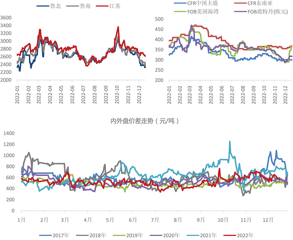 從庫存變化上看,2022年全年港口平均庫存在83.63萬噸,比上年上漲7.78%。2022年庫存均值上漲主要原因在于:二季度以來至7月進(jìn)口卸貨的大幅增加,以及華東區(qū)域疫情暴發(fā)導(dǎo)致的需求大幅走弱,使得港口庫存持續(xù)累庫至6月底;隨后,7~8月淡季當(dāng)?shù)?,需求不佳?dǎo)致消費及去庫不利,從而進(jìn)一步提高了全年的庫存均值水平。雖然8月份,因國際運力不足導(dǎo)致伊朗裝船驟減,進(jìn)口到貨開始大幅下降使得庫存也同步進(jìn)入了大幅去庫的階段,但尚未改變?nèi)ツ耆陰齑婢邓礁哂谏夏甑臓顟B(tài)。2022年“金九銀十”階段需求走暖,港口轉(zhuǎn)入去庫周期,國慶節(jié)后止跌回漲,走勢弱穩(wěn)。2022年企業(yè)庫存基本遵循歷史規(guī)律,只是國慶節(jié)后的累庫態(tài)勢較為強烈,集中反映了四季度疫情對內(nèi)地的顯著影響。