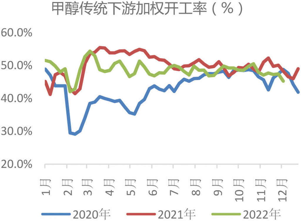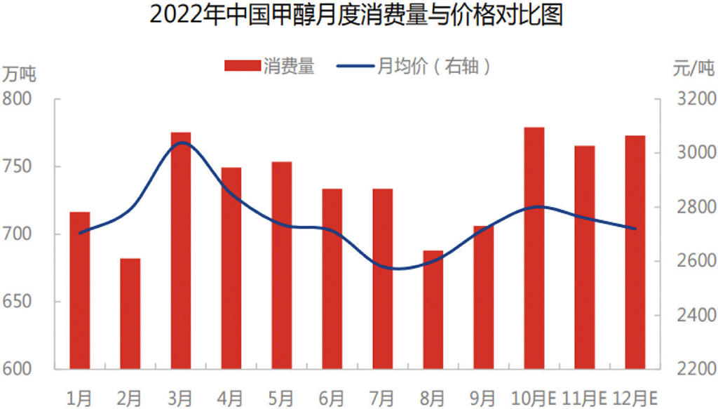 再看下游需求。2022年中國甲醇消費總量在8855.25萬噸,增速有所放緩,較上年上漲7.7%。從月度消費情況來看,甲醇消費量及下游開工率呈現(xiàn)先增后減再增的趨勢,與價格相關(guān)性較強。