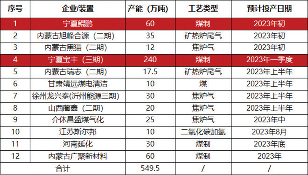 表為2023年國內(nèi)甲醇新增投產(chǎn)情況預(yù)估(萬噸)