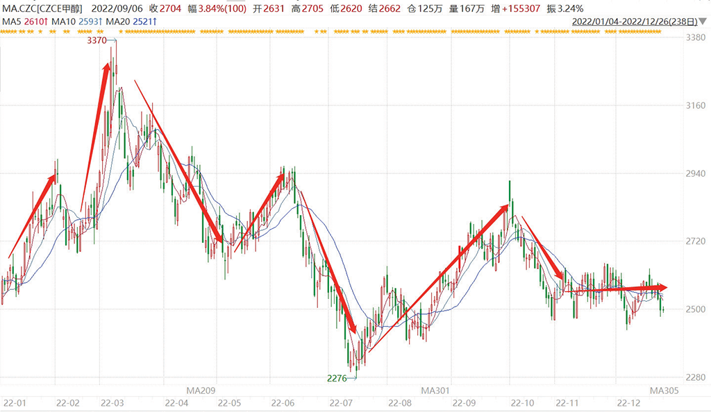 自去年6月中旬起,美聯(lián)儲超預(yù)期加息,國內(nèi)商品再次破位下行,甲醇期現(xiàn)貨亦同步坍塌式大跌,期貨主力最低降至2276點,較3月9日跌幅超過30%,市場對經(jīng)濟下滑及需求不振擔(dān)憂顯著。8月起在國內(nèi)甲醇供應(yīng)縮量、運輸受限導(dǎo)致進(jìn)口縮量背景下,市場呈現(xiàn)底部反彈行情,且金九銀十傳統(tǒng)旺季背景下市場走出一波較好反彈走勢。
