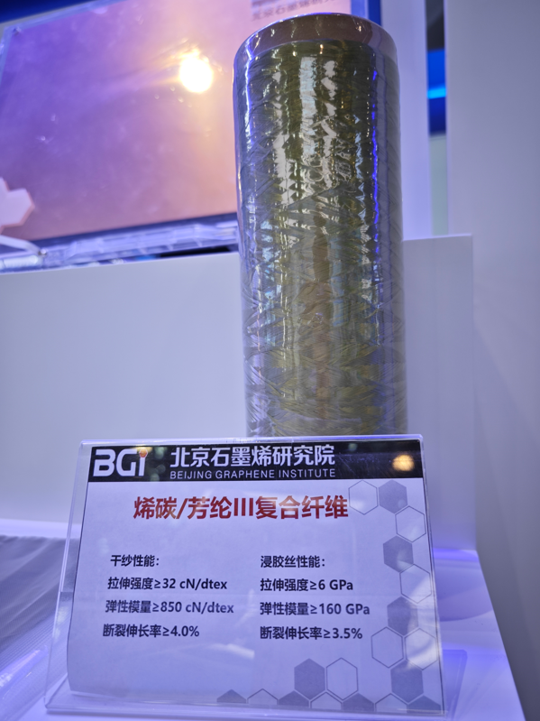 下圖展示的則是北京石墨烯研究院帶來(lái)的烯碳/芳綸III復(fù)合纖維。據(jù)了解,北京石墨烯研究院以擁有優(yōu)異力學(xué)性能的烯碳材料(石墨烯、碳納米管)作為增強(qiáng)體,開發(fā)了原位聚合制備烯碳/芳綸Ⅲ復(fù)合纖維,實(shí)現(xiàn)了應(yīng)力在基體與增強(qiáng)體之間的高效傳遞,達(dá)到有效增強(qiáng)、增韌芳綸Ⅲ纖維的目的。該型烯碳復(fù)合纖維,可有效提高芳綸纖維強(qiáng)度,可用于防彈材料、增強(qiáng)材料等領(lǐng)域。