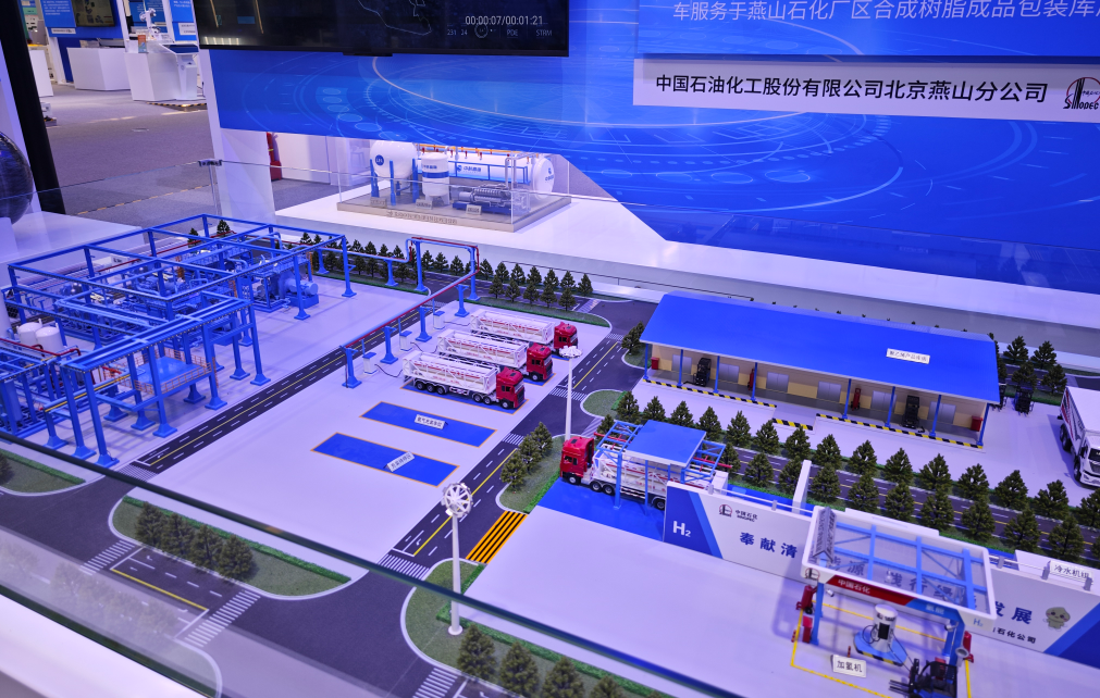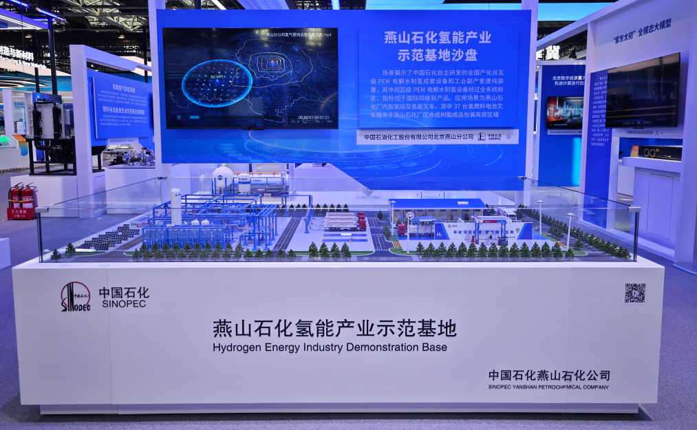 作為全國(guó)最大的氫氣生產(chǎn)利用主體,中國(guó)石化近年來(lái)每年氫氣生產(chǎn)利用量約為450萬(wàn)噸。目前,中國(guó)石化聚焦“氫能交通、綠氫煉化”兩大領(lǐng)域,首套自主研發(fā)兆瓦級(jí)PEM電解水制氫裝置已在燕山石化投產(chǎn)。下圖便是此次展出的燕山石化氫能產(chǎn)業(yè)示范基地沙盤。
