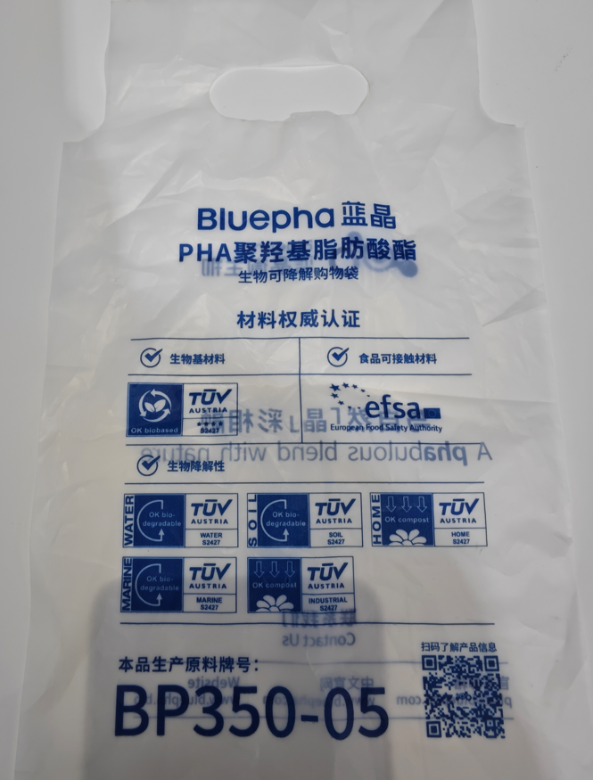 可降解塑料最為矚目的應(yīng)用領(lǐng)域當(dāng)屬塑料袋,本次展覽上,北京藍(lán)晶微生物科技有限公司展出了以PHA為原料制作的塑料袋。