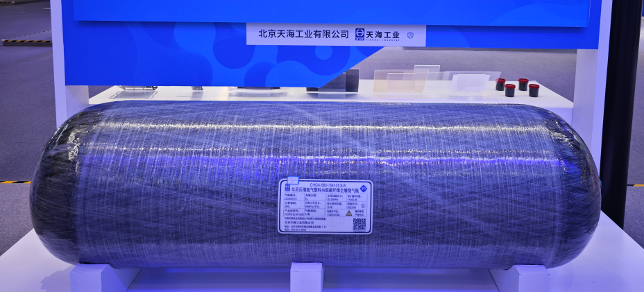 比如下圖這個(gè)大家伙。它的名字是35MPa-390L車用IV型儲(chǔ)氫氣瓶,其儲(chǔ)氫密度高、安全性高、重量輕、疲勞壽命長(zhǎng)、配套靈活,為氫燃料電池重卡提供了輕量化車載供氫系統(tǒng)新選擇。