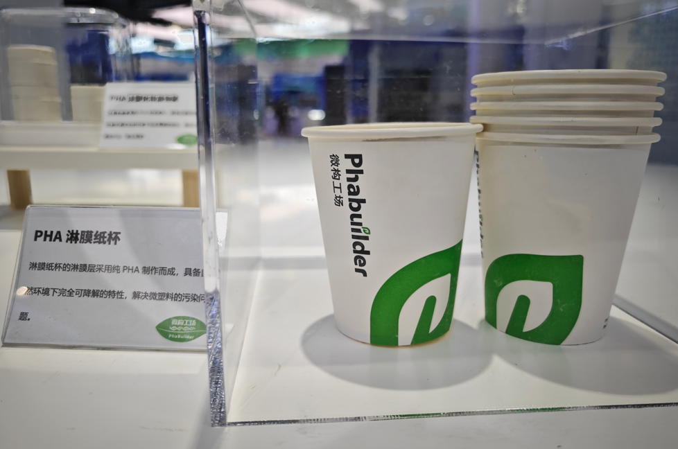 本次展覽中,微構(gòu)工廠帶來(lái)了其PHA制品。以下是微構(gòu)工廠生產(chǎn)的PHA變色纖維,PHA注塑模型及PHA淋膜紙杯。