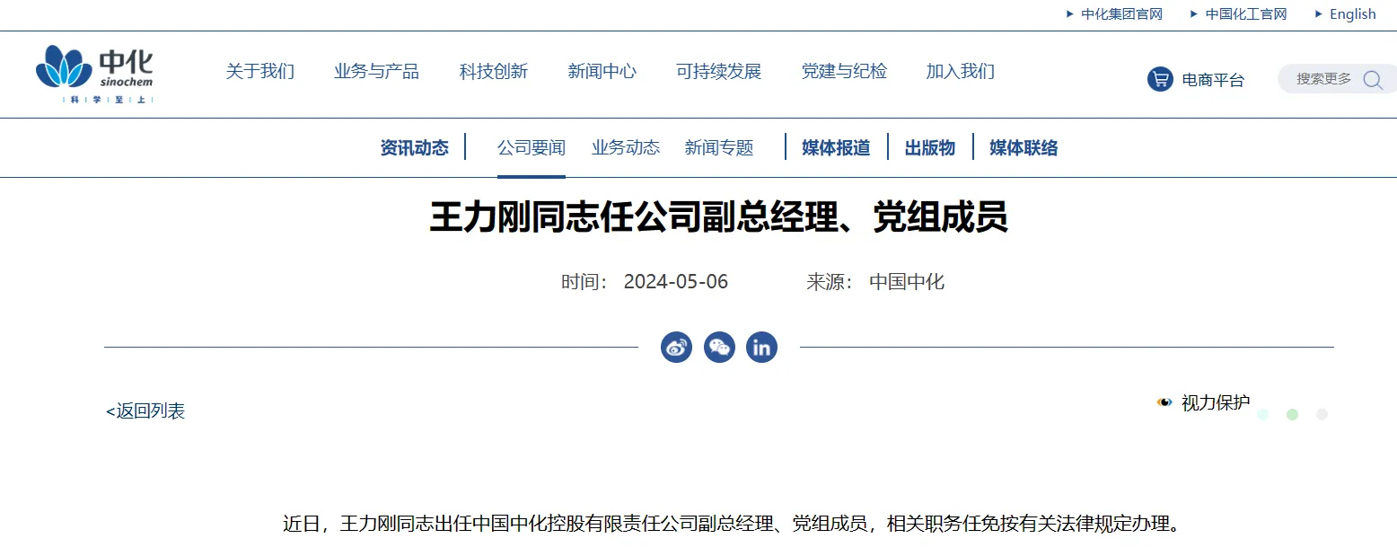 中國(guó)中化發(fā)布消息:王力剛出任中國(guó)中化控股有限責(zé)任公司副總經(jīng)理、黨組成員。
