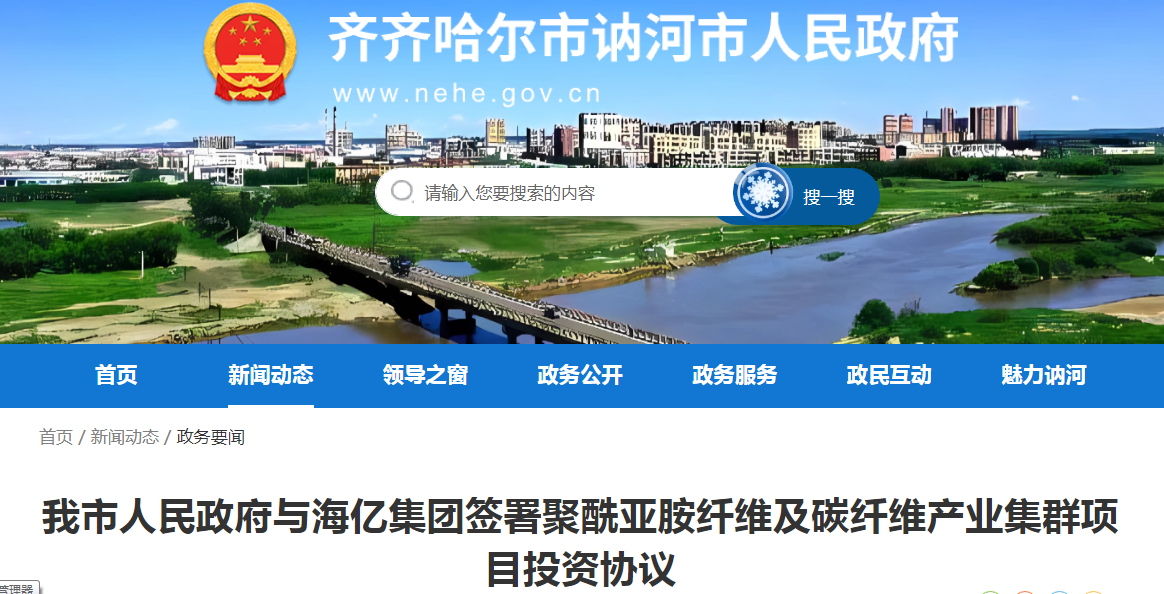 6月3日,根據(jù)齊齊哈爾市訥河市政府網(wǎng)站發(fā)布的最新消息顯示,訥河市政府市政府與海億科技產(chǎn)業(yè)集團(tuán)有限公司(以下簡(jiǎn)稱“海億科技”)已于6月1日簽署了聚酰亞胺纖維及碳纖維產(chǎn)業(yè)集群項(xiàng)目投資協(xié)議,項(xiàng)目總投資110億元,一期投資55億元,建成年產(chǎn)2萬噸聚酰亞胺纖維項(xiàng)目;二期投資55億元建成年產(chǎn)2.4萬噸聚丙烯腈基高性能碳纖維項(xiàng)目,進(jìn)一步推動(dòng)企業(yè)和訥河經(jīng)濟(jì)高質(zhì)量發(fā)展。