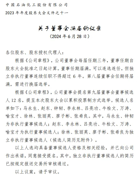近日,中國石化發(fā)布公告,將對公司董事會進(jìn)行換屆,第九屆董事會候選人名單如下:馬永生、趙東、鐘韌、李永林、呂亮功、牛栓文、萬濤、 喻寶才、徐林、張麗英、廖子彬、張希良。
