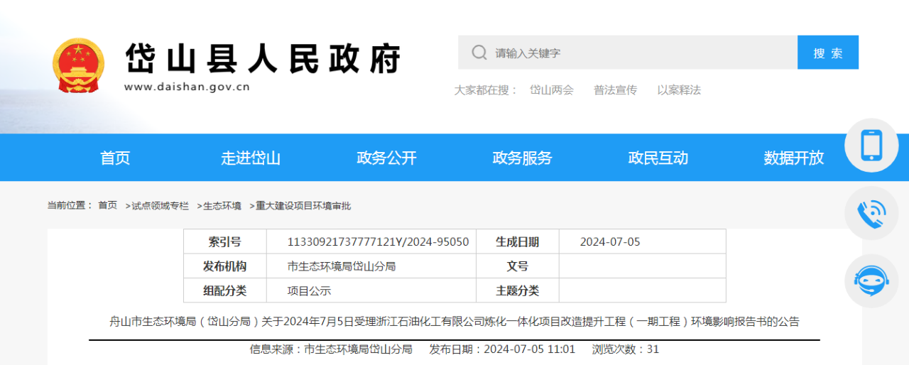 7月5日,岱山縣人民政府發(fā)布公告,舟山市生態(tài)環(huán)境局(岱山分局)已受理浙江石油化工有限公司煉化一體化項(xiàng)目改造提升工程(一期工程)環(huán)境影響報(bào)告書。