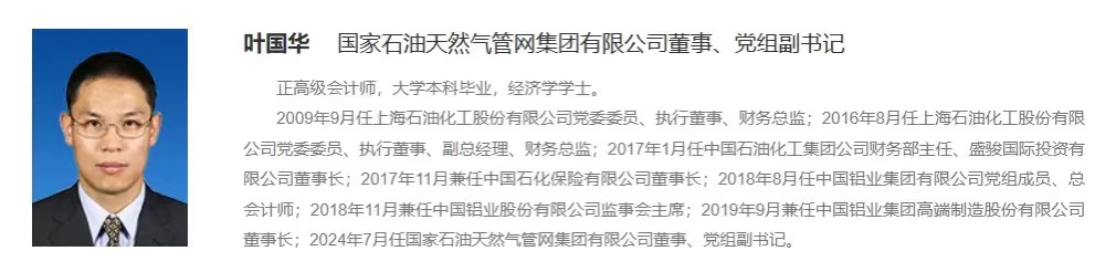 2024年7月,葉國華任國家石油天然氣管網(wǎng)集團有限公司董事、黨組副書記。