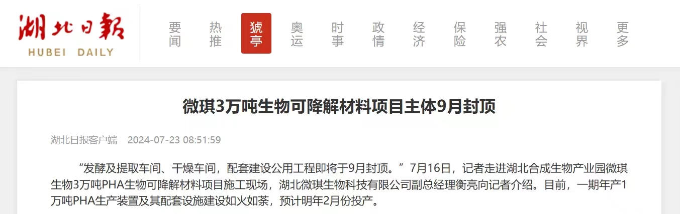 7月23日,據(jù)湖北日?qǐng)?bào)消息,湖北合成生物產(chǎn)業(yè)園微琪生物3萬噸/年P(guān)HA項(xiàng)目主體9月封頂,一期年產(chǎn)1萬噸PHA生產(chǎn)裝置預(yù)計(jì)明年2月份投產(chǎn)。