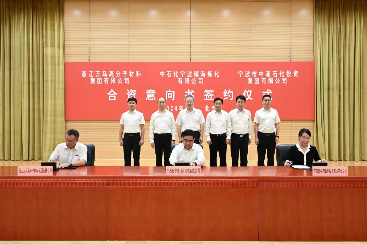 2024年8月8日,中石化寧波鎮(zhèn)海煉化有限公司與浙江萬(wàn)馬高分子材料集團(tuán)有限公司、寧波市中浦石化投資集團(tuán)有限公司,在北京舉辦《合資意向書》簽約儀式。