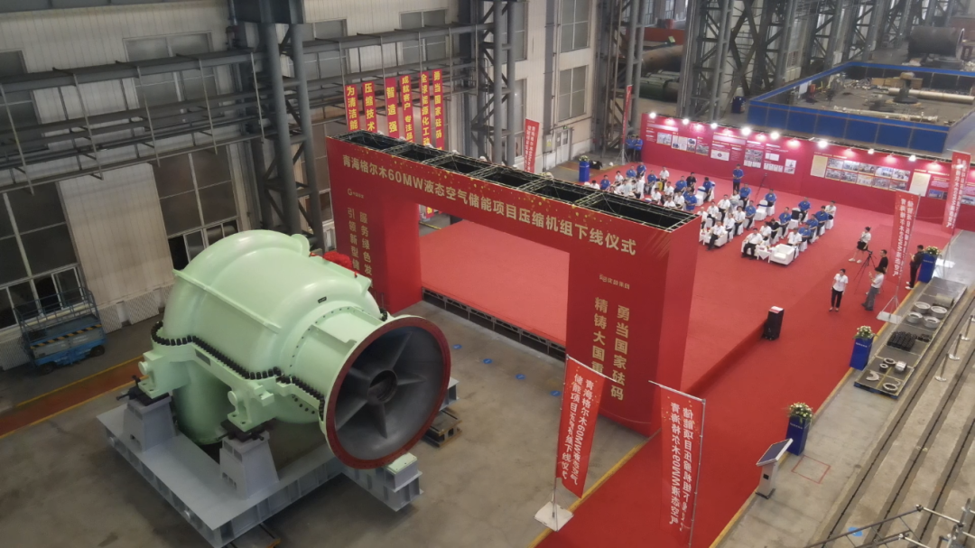 8月17日上午,青海格爾木60MW液態(tài)空氣儲能示范項目壓縮機(jī)組下線儀式在沈鼓集團(tuán)營口透平廠區(qū)總裝車間舉行。據(jù)悉,該儲能示范項目建成后將成為液態(tài)空氣儲能領(lǐng)域發(fā)電功率世界第一、儲能規(guī)模世界最大的示范項目,其配套壓縮機(jī)是世界最大規(guī)模水平剖分式離心壓縮機(jī)。