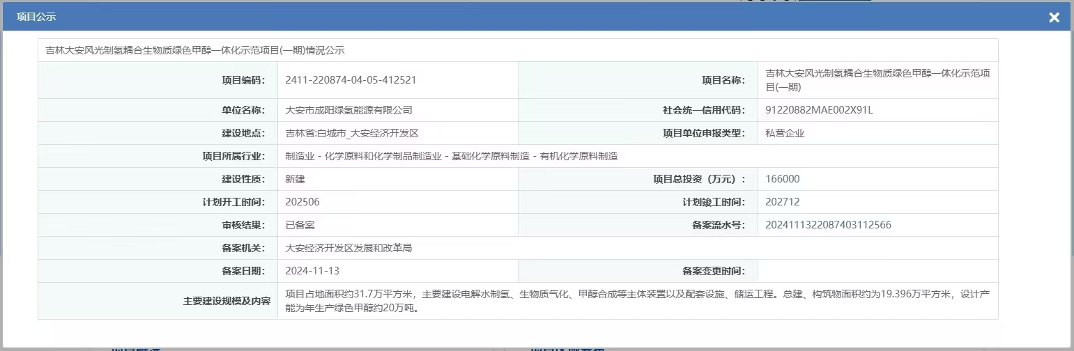 11月13日,吉林大安風光制氫耦合生物質(zhì)綠色甲醇一體化示范項目(一期)獲備案。