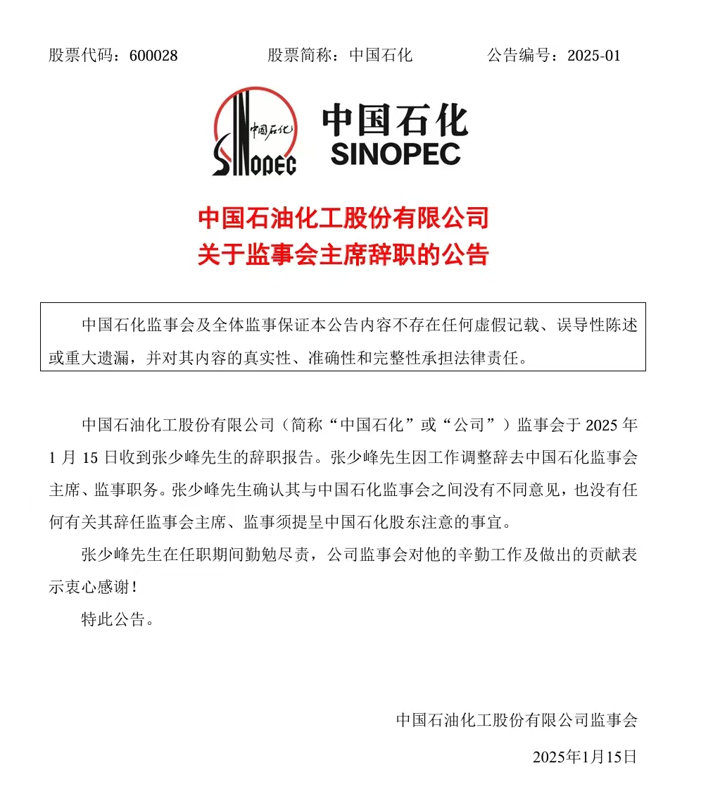 近日,中國(guó)石化發(fā)布公告稱,公司監(jiān)事會(huì)于1月15日收到張少峰先生的辭職報(bào)告。張少峰先生因工作調(diào)整辭去中國(guó)石化監(jiān)事會(huì)主席、監(jiān)事職務(wù)。