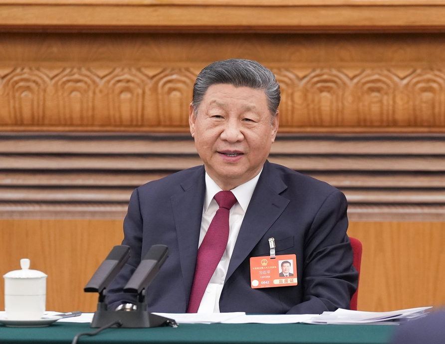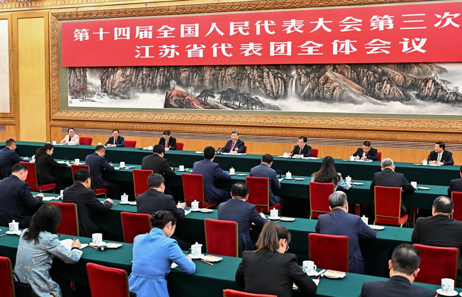 3月5日下午,中共中央總書記、國家主席、中央軍委主席習近平參加他所在的十四屆全國人大三次會議江蘇代表團審議。新華社發(fā)(占政 攝)