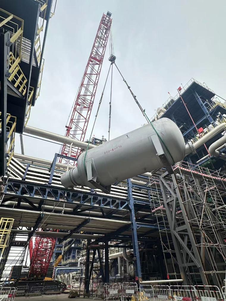 5月8日下午,由石化四建公司承擔(dān)的中國(guó)石化天津石化煉油部聯(lián)合九車間A管廊柴油蒸汽發(fā)生器吊裝順利完成。