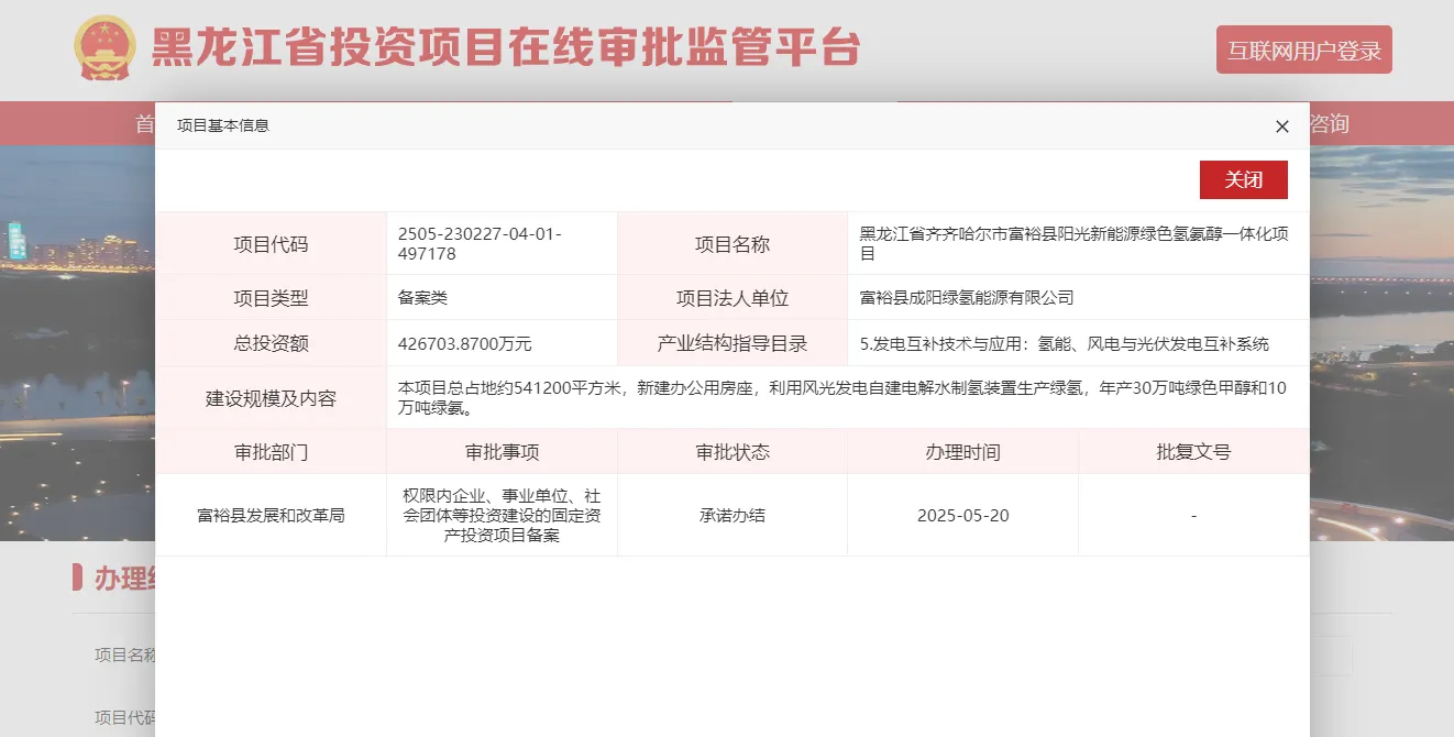 據(jù)黑龍江省投資項目在線審批監(jiān)管平臺消息,5月20日,黑龍江省齊齊哈爾市富??h陽光新能源綠色氫氨醇一體化項目備案。