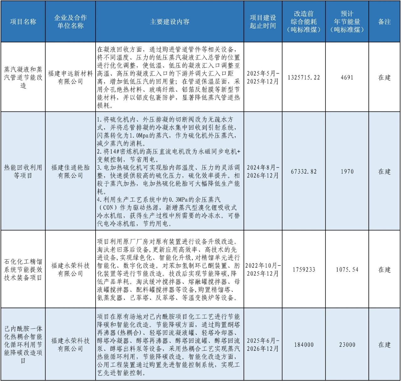 值得關(guān)注的是,25個項(xiàng)目中,有4個涉化項(xiàng)目。分別是:福建申遠(yuǎn)新材料有限公司蒸汽凝液和蒸汽管道節(jié)能改造項(xiàng)目、福建佳通輪胎有限公司熱能回收利用項(xiàng)目、福建永榮科技有限公司石化化工精餾系統(tǒng)節(jié)能提效技術(shù)裝備項(xiàng)目以及己內(nèi)酰胺一體化熱耦合智能化循環(huán)利用節(jié)能降碳改造項(xiàng)目。