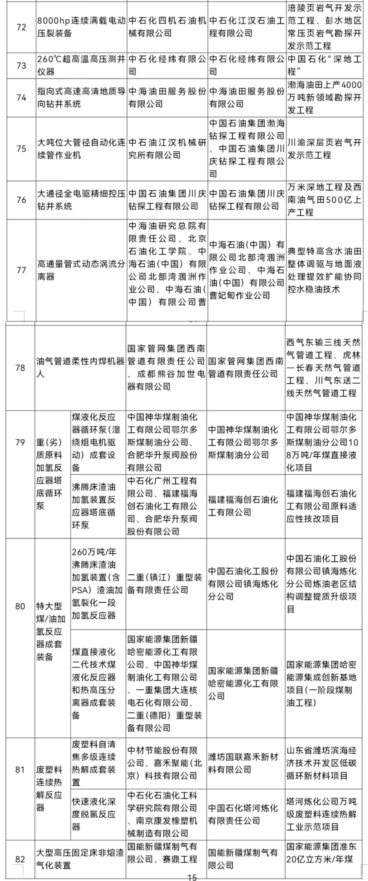 其中,在能源化工領(lǐng)域,中石化、中石油、中海油、國(guó)家能源集團(tuán)等企業(yè)的多臺(tái)套技術(shù)裝備入圍名單。具體見(jiàn)下表: