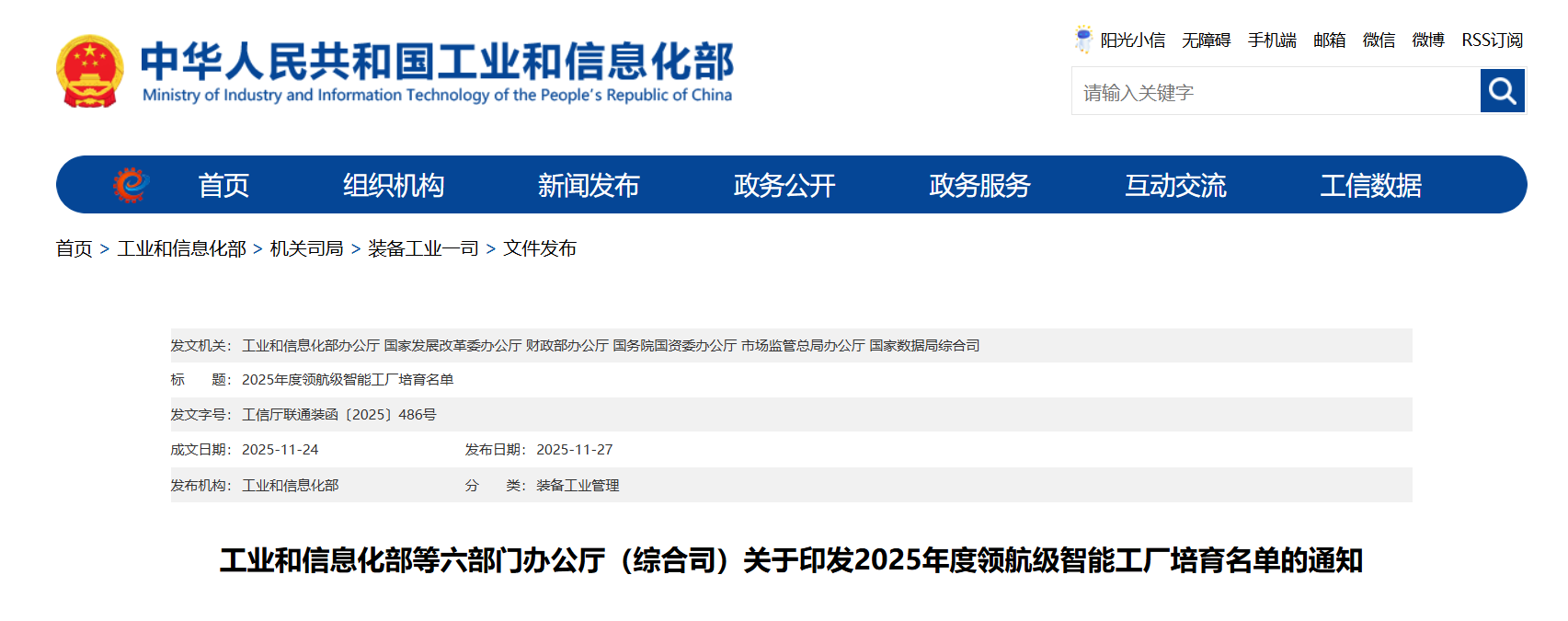 工業(yè)和信息化部等六部門辦公廳(綜合司)關于印發(fā)2025年度領航級智能工廠培育名單的通知