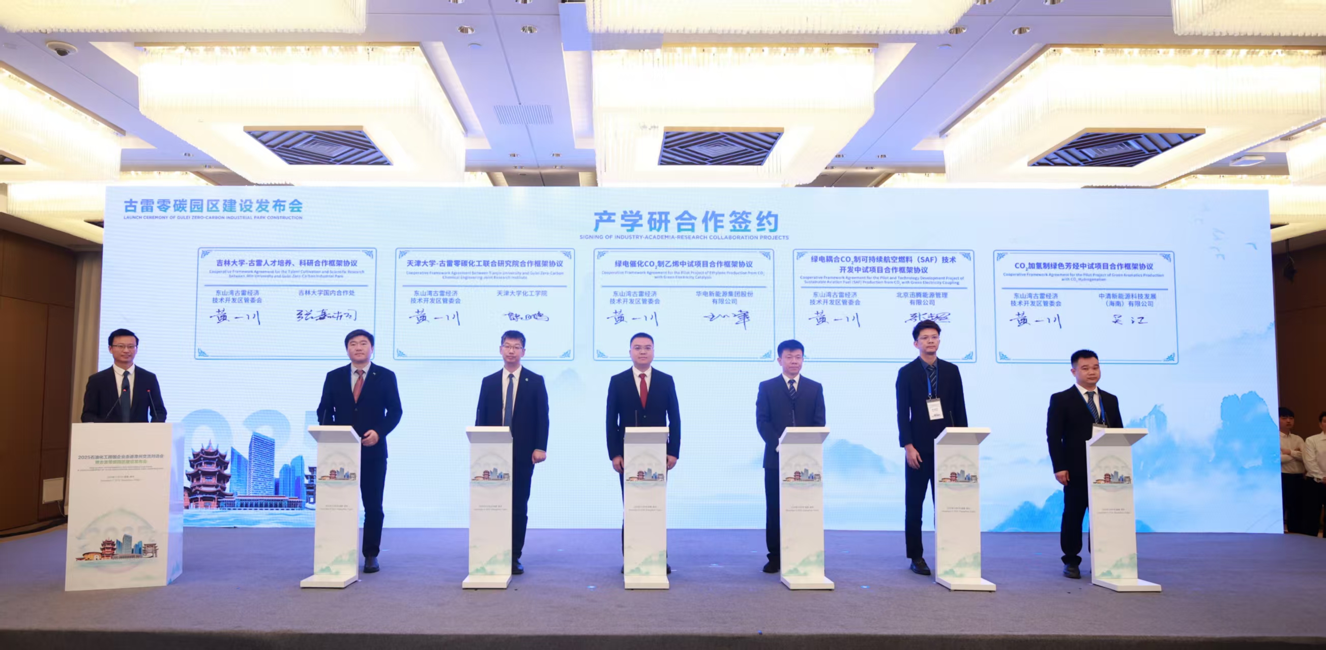 在本次活動中,古雷開發(fā)區(qū)還和多家企業(yè)簽訂了CO2加氫制綠色芳烴、綠電耦合CO2制可持續(xù)航空燃料(SAF)技術(shù)開發(fā)、綠電催化CO2制乙烯等一批前沿科創(chuàng)項目,并與吉林大學(xué)、天津大學(xué)簽訂框架協(xié)議,深化人才培養(yǎng)、科研合作,聚合產(chǎn)研資源要素,助力零碳園區(qū)建設(shè),推動古雷綠色轉(zhuǎn)型升級從能源替代的產(chǎn)業(yè)布局,走向科技創(chuàng)新深水區(qū)。