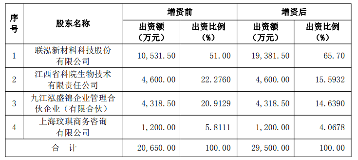 12月6日,聯(lián)泓新科發(fā)布公告稱,為加快公司戰(zhàn)略布局及發(fā)展,補充江西科院生物新材料有限公司流動資金,改善其資產(chǎn)負(fù)債結(jié)構(gòu),公司擬以自有資金向科院生物增資1.5億元,科院生物其他股東不同步參與本次增資。其中,8850萬元計入注冊資本,剩余6150萬元計入資本公積。