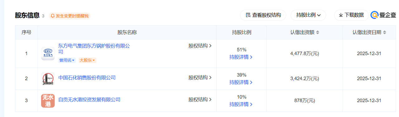 股東信息顯示:東方電氣集團東方鍋爐股份有限公司持股51%,中國石化銷售股份有限公司39%,自貢無水港投資發(fā)展有限公司持股10%。