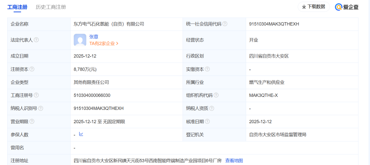 據(jù)愛企查消息,12月12日,東方電氣石化氫能(自貢)有限公司成立,注冊資本8780萬元。