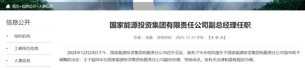 12月23日,據(jù)國家能源集團官網(wǎng)消息,國家能源投資集團有限責任公司召開會議,宣布了中央組織部關于國家能源投資集團有限責任公司領導班子調(diào)整的決定:王子超同志任國家能源投資集團有限責任公司副總經(jīng)理、黨組成員。按有關法律和章程規(guī)定辦理。