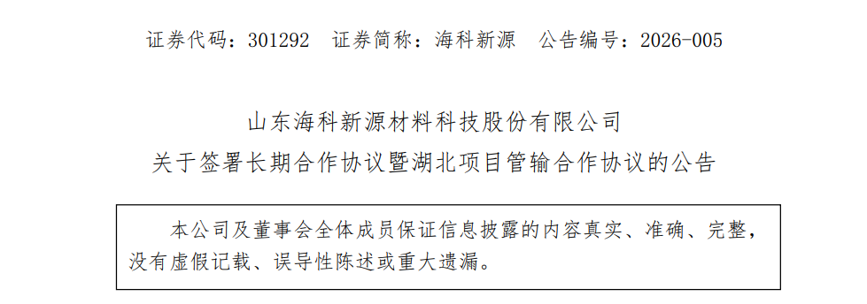 1月26日,山東??菩略床牧峡萍脊煞萦邢薰?以下簡稱“??菩略?rdquo;)發(fā)布公告稱,??菩略磁c深圳市比亞迪鋰電池有限公司(以下簡稱“比亞迪鋰電池”)于2026年1月23日簽署《長期合作協(xié)議暨湖北項目管輸合作協(xié)議》(以下簡稱“本協(xié)議”)。協(xié)議約定,協(xié)議有效期為3年,在協(xié)議有效期內,??菩略匆怨茌敺绞较虮葋喌箱囯姵睾表椖抗獏f(xié)議所購產品每年至少10萬噸。