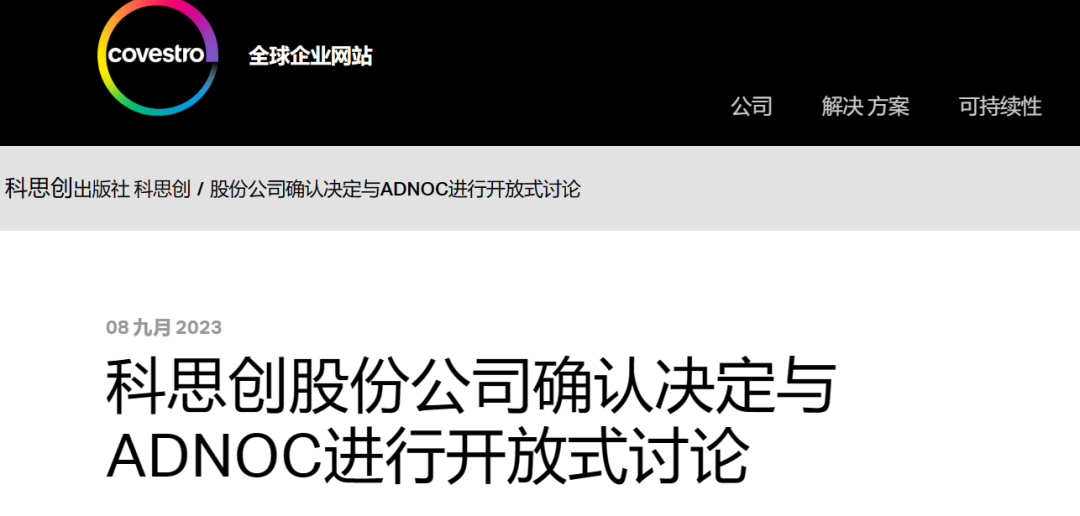 9月8日,科思創(chuàng)發(fā)布新聞,公開(kāi)表態(tài)確認(rèn)就ADNOC收購(gòu)一事進(jìn)行開(kāi)放式討論。科思創(chuàng)管理委員會(huì)還將特別討論如何保障進(jìn)一步實(shí)施以未來(lái)和可持續(xù)發(fā)展為導(dǎo)向的公司戰(zhàn)略,包括相應(yīng)的公司管理規(guī)定。