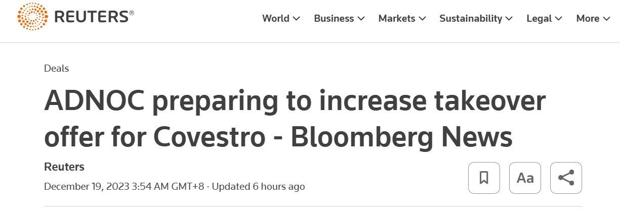 6月20日,據(jù)路透社報(bào)道,知情人士透露,ADNOC已與科思創(chuàng)接洽,提出價(jià)值超過(guò)100億歐元的收購(gòu)提案,這一非正式出價(jià)折合每股約55歐元消息傳出沒(méi)多久,彭博新聞社便爆出科思創(chuàng)拒絕了ADNOC最初收購(gòu)提議消息,理由是擬議的估值不值得進(jìn)一步談判。