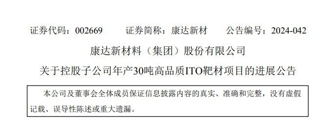 同日,康達(dá)新材發(fā)布的另一份公告對(duì)子公司年產(chǎn)30噸高品質(zhì)ITO靶材項(xiàng)目的進(jìn)展情況進(jìn)行了說明。