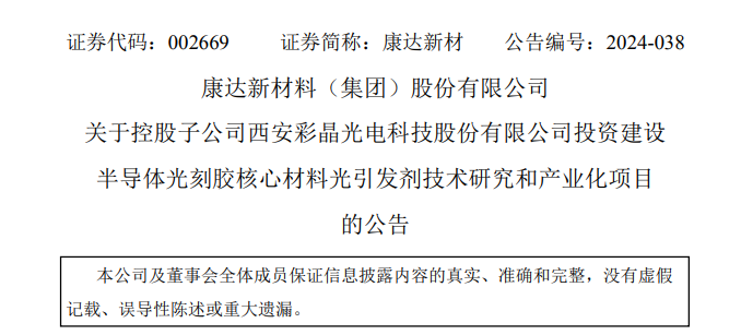 公司表示,為深化落實(shí)康達(dá)新材料(集團(tuán))股份有限公司“新材料+ 電子科技”戰(zhàn)略布局,進(jìn)一步優(yōu)化公司控股子公司西安彩晶光電科技股份有限公司 產(chǎn)品結(jié)構(gòu),填補(bǔ)國(guó)內(nèi)空白,實(shí)現(xiàn)國(guó)產(chǎn)替代,解決光刻膠核心材料“卡脖子”問題,突破國(guó)際技術(shù)和市場(chǎng)壟斷,有力提升我國(guó)光刻產(chǎn)業(yè)鏈自主可控水平。彩晶光電擬投資建設(shè)“半導(dǎo)體光刻膠核心材料光引發(fā)劑技術(shù)研究和產(chǎn)業(yè)化項(xiàng)目”,最終投資金額以項(xiàng)目建設(shè)實(shí)際投入為準(zhǔn)。