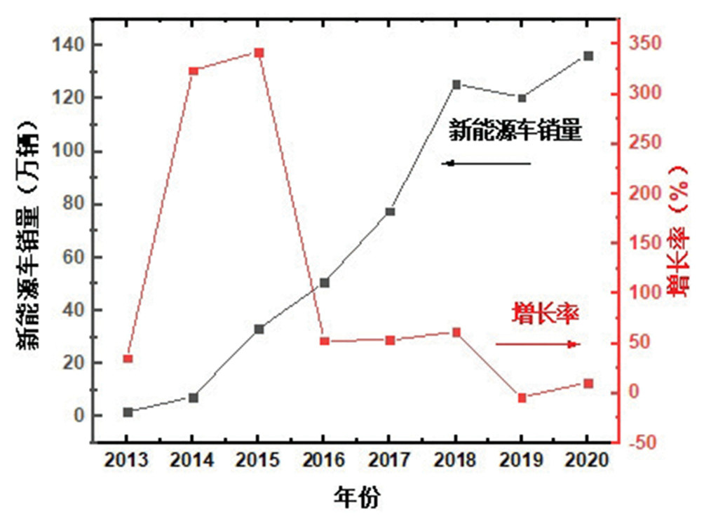 自2013年以來,我國新能源汽車銷量呈現(xiàn)逐年增加趨勢,但增長率變化較大。2014年、2015年受新能源補(bǔ)貼影響,增長率維持在300%左右;受新能源騙補(bǔ)調(diào)查、補(bǔ)貼退坡影響以及準(zhǔn)入門檻提升之后,至2018年保持在50%左右;2019年新能源汽車進(jìn)一步退坡,首次出現(xiàn)新能源汽車年度銷量下滑。至此,新能源汽車逐漸由政策驅(qū)動(dòng)向市場驅(qū)動(dòng)轉(zhuǎn)變。2020年我國新能源汽車銷售136萬輛,純電動(dòng)汽車111萬輛,插電混動(dòng)汽車25萬輛,燃料電池汽車1000輛。2021年1~10月,新能源汽車銷售254萬輛,其中純電動(dòng)汽車210萬輛,插電式混合動(dòng)力汽車43.7萬輛,燃料電池汽車953輛。