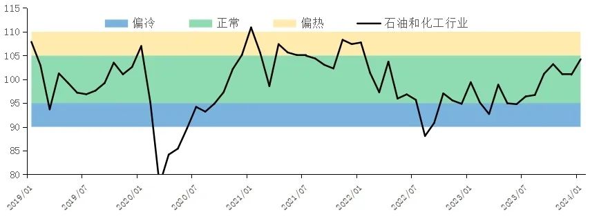 1月,石油和化工行業(yè)景氣指數(shù)明顯上漲,漲至104.20,較2023年12月上漲3.23個(gè)百分點(diǎn),接近偏熱區(qū)間的臨界點(diǎn);較2023年1月上漲4.82個(gè)百分點(diǎn),同比增速較12月回落1.3個(gè)百分點(diǎn)。剔除季節(jié)性因素影響,僅石油和天然氣開采業(yè)景氣指數(shù)同比下降5.75個(gè)百分點(diǎn),燃料加工業(yè),化學(xué)原料和化學(xué)制品制造業(yè),橡膠、塑料及其他聚合物制品制造業(yè)景氣指數(shù)同比分別增長8.63個(gè)百分點(diǎn)、7.95個(gè)百分點(diǎn)和7.20個(gè)百分點(diǎn),4個(gè)分行業(yè)景氣指數(shù)的同比降幅以及同比增幅均有所收窄。