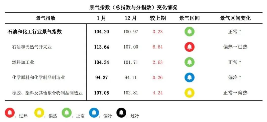 1月,石油和化工行業(yè)景氣指數(shù)環(huán)比出現(xiàn)較大幅度上漲,結(jié)束了連續(xù)兩個(gè)月的下降。分行業(yè)來看,受中東地區(qū)地緣政治危機(jī)溢出效應(yīng)、美國原油生產(chǎn)下降等影響,國際油價(jià)持續(xù)上漲,石油和天然氣開采業(yè)、燃料加工業(yè)景氣指數(shù)環(huán)比分別上漲6.64個(gè)百分點(diǎn)和2.63個(gè)百分點(diǎn),其中石油和天然氣開采業(yè)景氣指數(shù)從偏熱區(qū)間上升至過熱區(qū)間。在春節(jié)消費(fèi)需求的帶動(dòng)下,橡膠、塑料及其他聚合物制品制造業(yè)景氣指數(shù)環(huán)比上升4.24個(gè)百分點(diǎn),從正常區(qū)間上升到偏熱區(qū)間。受此影響,化學(xué)原料和化學(xué)制品制造業(yè)景氣指數(shù)環(huán)比上升0.26個(gè)百分點(diǎn)。