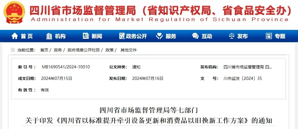 四川省市場監(jiān)督管理局等七部門聯(lián)合印發(fā)《四川省以標(biāo)準(zhǔn)提升牽引設(shè)備更新和消費品以舊換新工作方案》