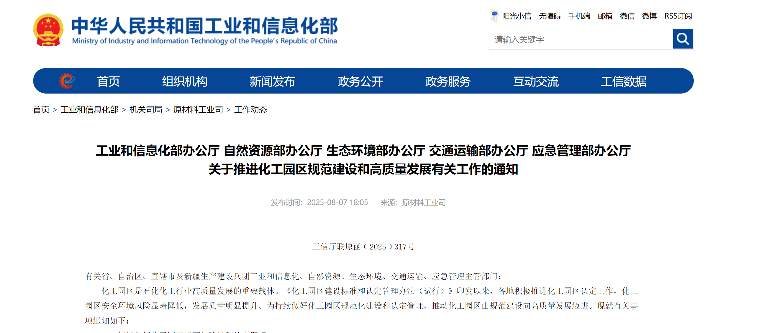 工信部等五部門聯(lián)合印發(fā)《關(guān)于推進化工園區(qū)規(guī)范建設(shè)和高質(zhì)量發(fā)展有關(guān)工作的通知》