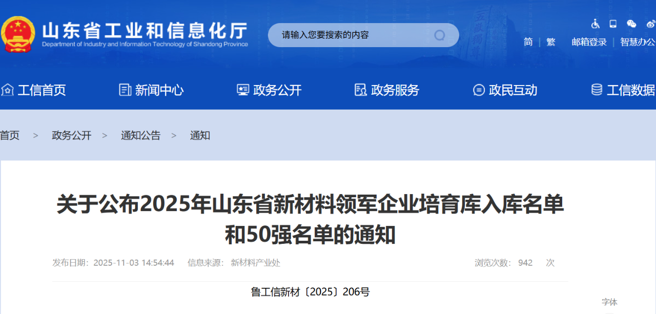 山東省工業(yè)和信息化廳于2025年11月3日正式公布2025年山東省新材料領軍企業(yè)培育庫入庫名單及新材料領軍企業(yè)50強名單,旨在健全優(yōu)質企業(yè)梯度培育體系,加快培育新質生產力,提升全省新材料產業(yè)核心競爭力。