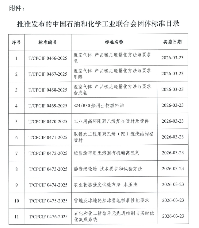 中國(guó)石油和化學(xué)工業(yè)聯(lián)合會(huì)近日發(fā)布公告,批準(zhǔn)《溫室氣體 產(chǎn)品碳足跡量化方法與要求 氫》等11項(xiàng)團(tuán)體標(biāo)準(zhǔn),內(nèi)容覆蓋氫、甲醇、合成氨的碳足跡量化以及船用生物燃料、環(huán)保管材等多個(gè)重點(diǎn)領(lǐng)域,全部標(biāo)準(zhǔn)將于2026年3月23日起正式實(shí)施。