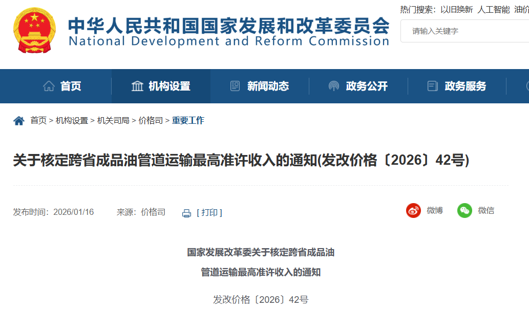 國(guó)家發(fā)展改革委印發(fā)《關(guān)于核定跨省成品油管道運(yùn)輸最高準(zhǔn)許收入的通知》