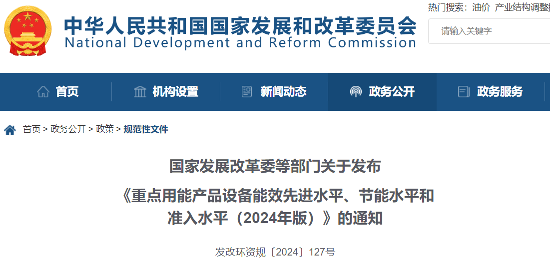 國家發(fā)改委等部門關于發(fā)布《重點用能產(chǎn)品設備能效先進水平、節(jié)能水平和準入水平(2024年版)》的通知