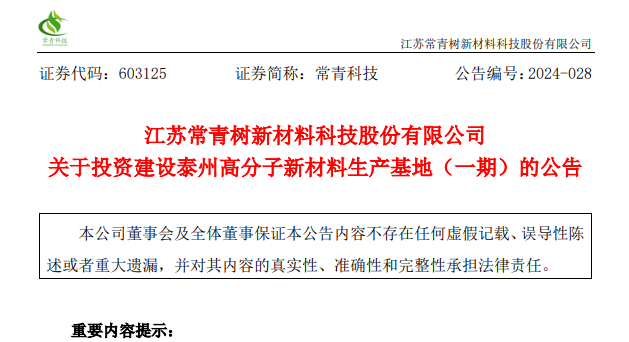 5月15日晚間,常青科技發(fā)布關(guān)于投資建設(shè)泰州高分子新材料生產(chǎn)基地(一期)的公告。