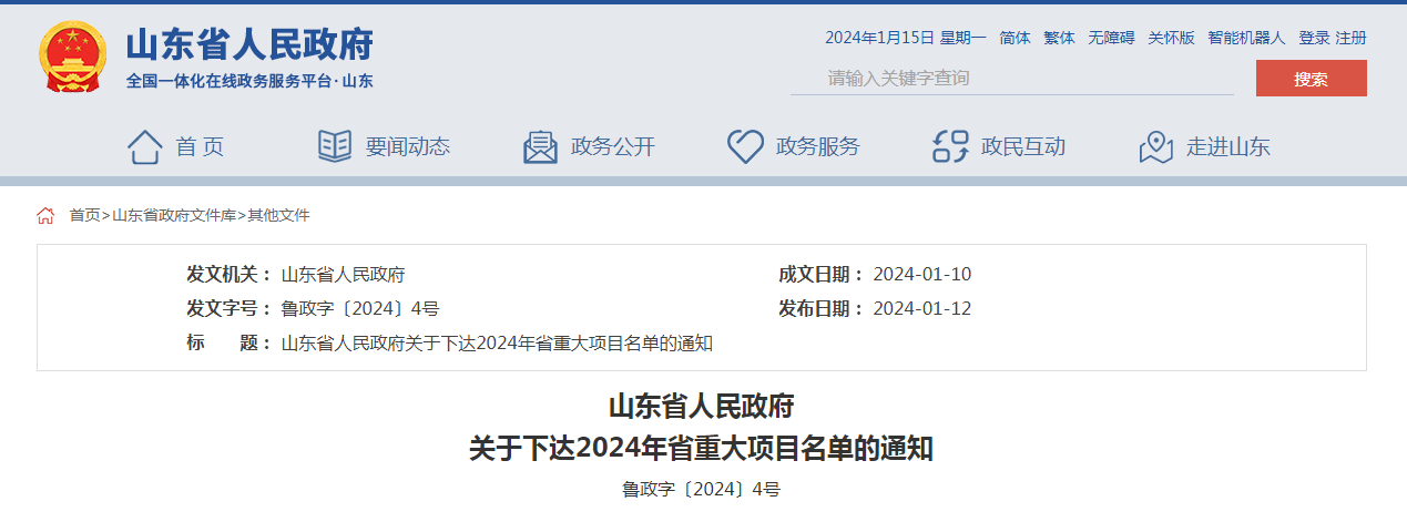 山東省政府網(wǎng)1月12日公布了2024年山東省重大項目名單。其中,重大實施類項目555個,重大準備類項目45個。