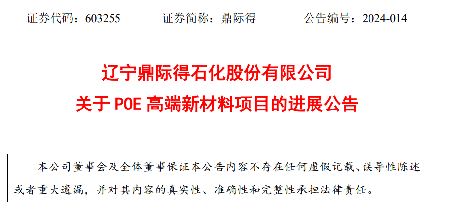 1月18日,鼎際得發(fā)布公告,近日,石化科技已取得遼寧省發(fā)改委批復的《省發(fā)展改革委關于遼寧鼎際得石化科技有限公司遼寧鼎際得石化高端新材料項目節(jié)能報告的審查意見》,原則同意所報節(jié)能報告。